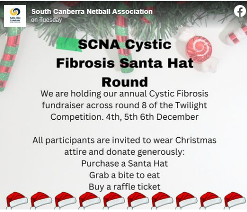 This week SCNA is running the annual fundraiser for Cystic Fibrosis. All players and supporters are invited to wear Christmas attire and donate. More details: